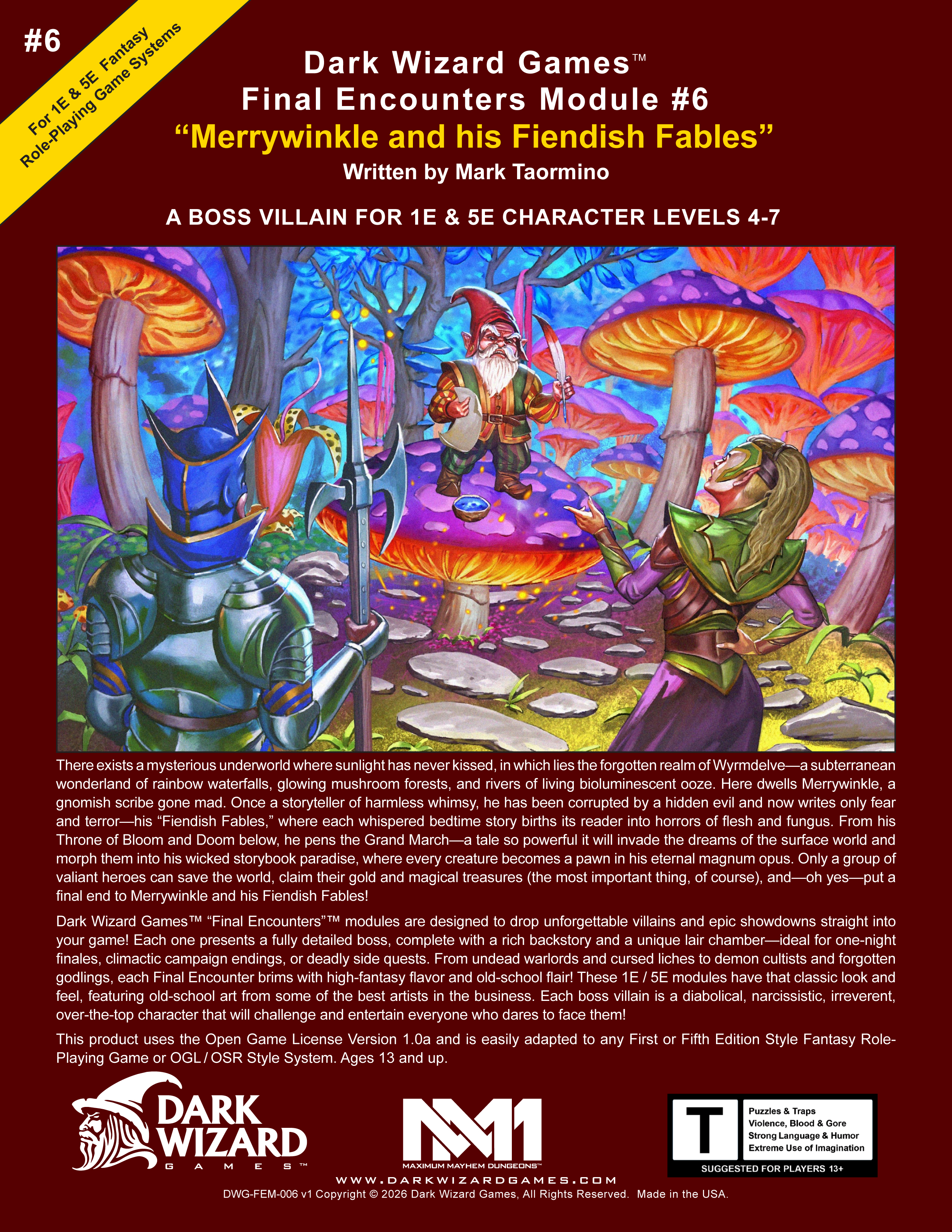 | Dark Wizard Games creates Open-Gaming content that works across role-playing systems, bringing you new adventures to enrich your fantasy gaming. Our Maximum Mayhem Dungeons Series continues to redefine the genre while preserving the classic look and feel of the original 1st Edition AD&D style adventures we all love. Our website securely accepts payments by VISA [debit/credit], MASTERCARD [debit/credit], AMEX, DISCOVER, PAYPAL, PAYPAL PAY LATER and VENMO! ALL ORDERS SHIP NEXT DAY (AS LONG AS THERE IS POSTAL SERVICE) USA go via MEDIA MAIL and INTERNATIONAL go by USPS FIRST CLASS! |