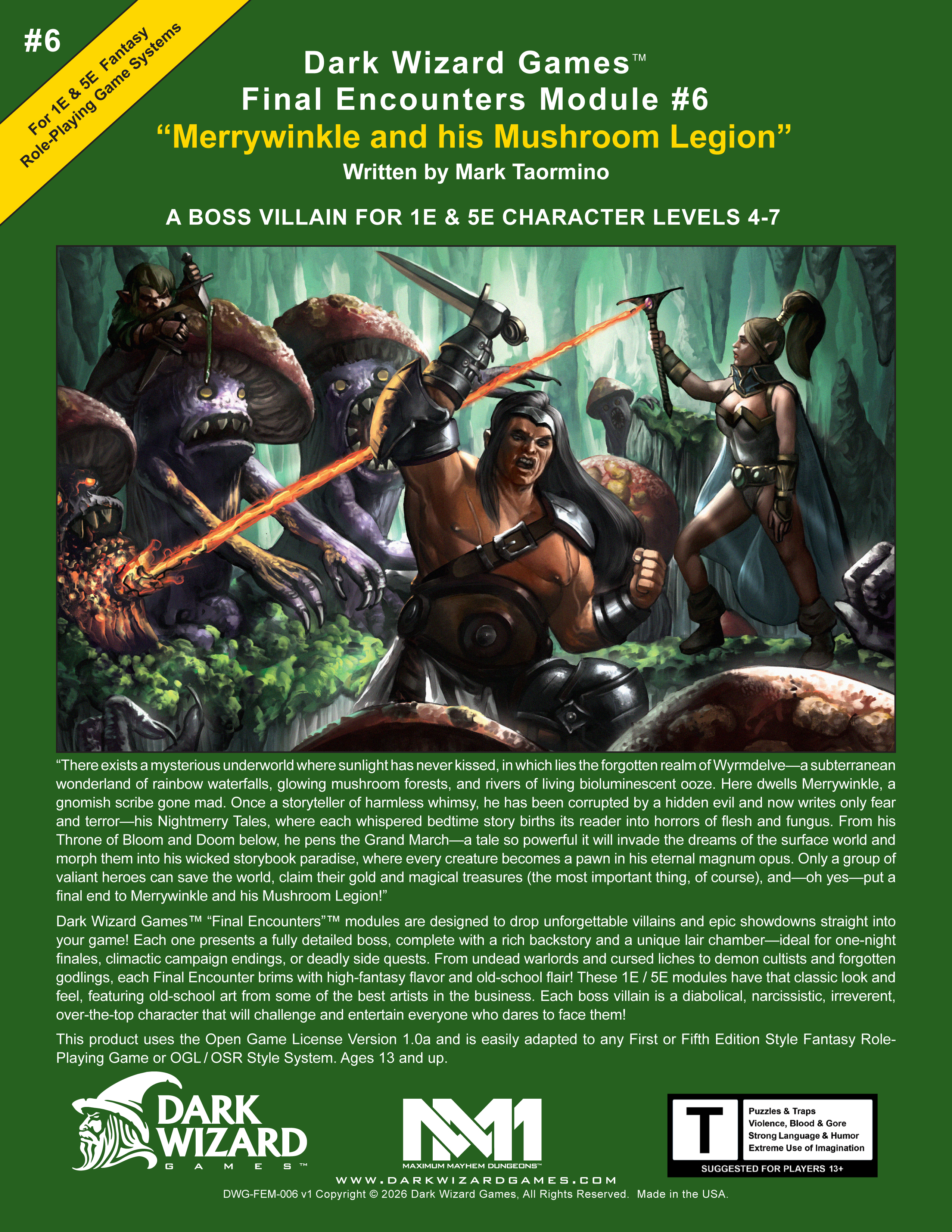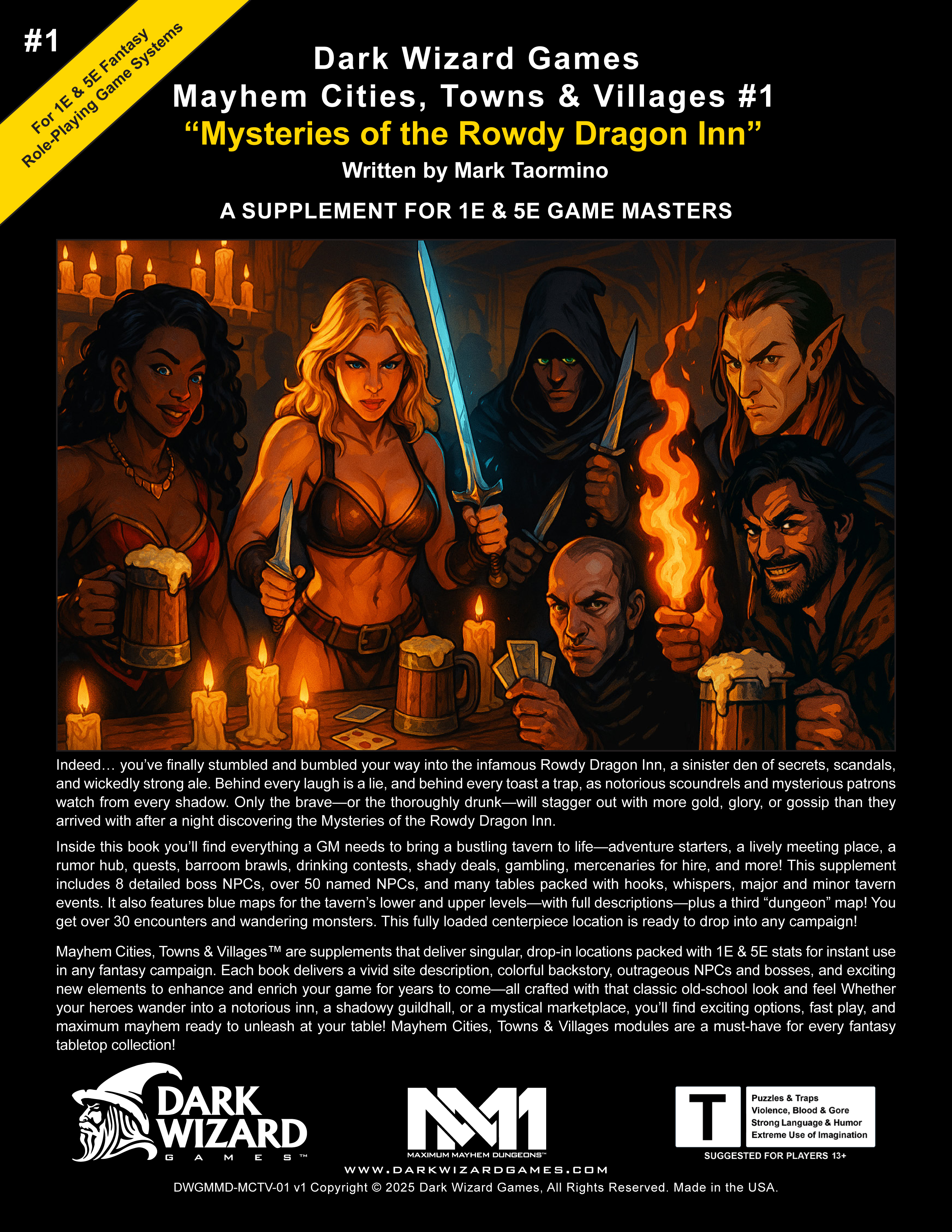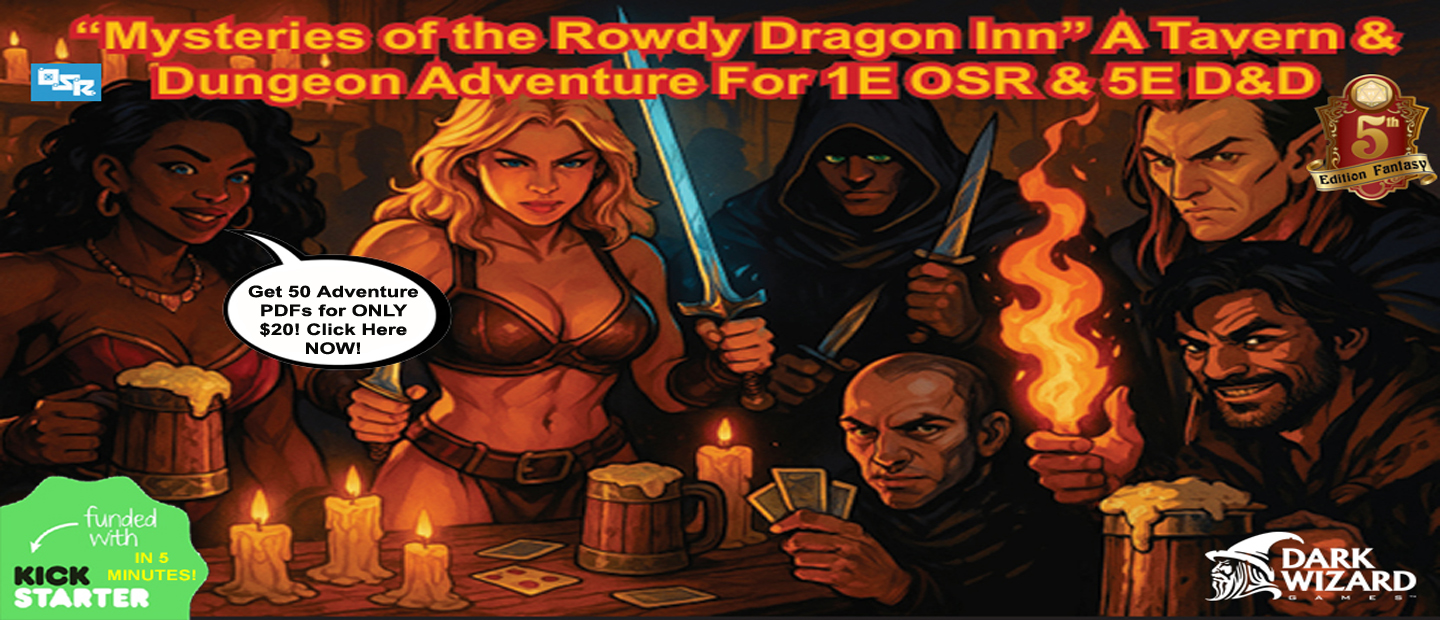 | Dark Wizard Games creates Open-Gaming content that works across role-playing systems, bringing you new adventures to enrich your fantasy gaming. Our Maximum Mayhem Dungeons Series continues to redefine the genre while preserving the classic look and feel of the original 1st Edition AD&D style adventures we all love. Our website securely accepts payments by VISA [debit/credit], MASTERCARD [debit/credit], AMEX, DISCOVER, PAYPAL, PAYPAL PAY LATER and VENMO! ALL ORDERS SHIP NEXT DAY (AS LONG AS THERE IS POSTAL SERVICE) USA go via MEDIA MAIL and INTERNATIONAL go by USPS FIRST CLASS! |